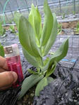 四国は高知県が一大産地で暖地のトルコは多分6月後半~7月中旬くらいやと思うから同じ時期に出してもかなわないんでトンネルも今月から外して昼間は開けっ放しでワザと寒い環境作って無い時期に出せるような栽培してるから定植して4ヶ月近くなるけどまだこのサイズです?最近日中は20℃越すようなお日よりやから日に日に大きく成長しだしたけど咲くまではまだまだまだまだかかりそうです